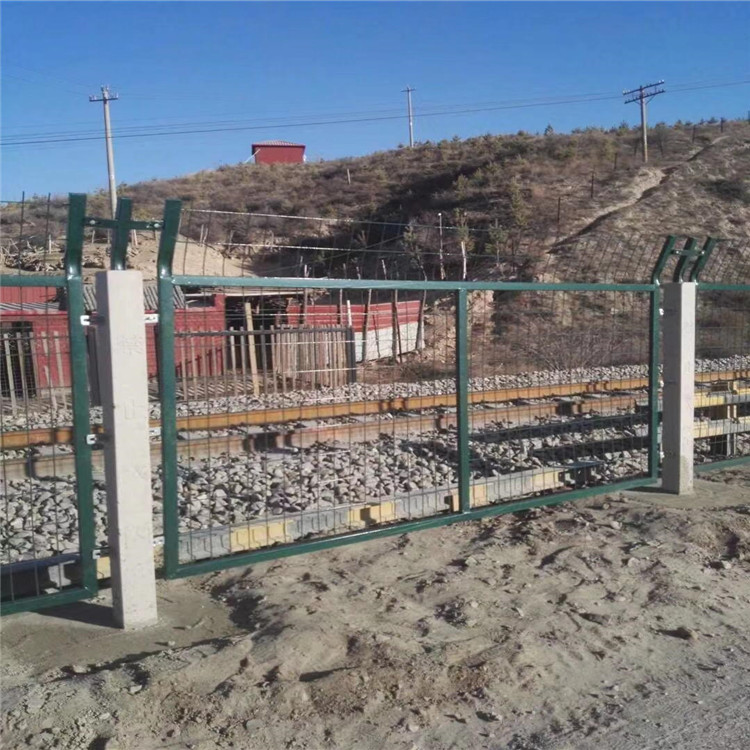 隨著人們出行需要,近年來增加了許多新修的高速鐵路和改建鐵路的項目,為了保護路段安全要設立鐵路專用防護柵欄,鐵路防護柵欄主要分為兩種:鐵路通線(2012)8001,鐵路通線(2012)8002。 整體尺寸:1800*3000mm(立柱中心距至立柱中心距);網片尺寸1797*2760mm,1700*2760mm;邊框:30*50mm矩形管,壁厚2.0mm;絲經:4.0mm(塑前)*75mm*150mm;小立柱:40*40mm*2.5mm*497mm;大立柱:120*120mm*2200mm;基礎尺寸:600*600*700毫米,現(xiàn)場基坑開挖放入立柱后,采用C25混凝土澆筑,單個數(shù)量0.242m3。表面處理:整體熱鍍鋅處理,上鋅量270g/㎡,后浸塑塑層厚度0.8-1.2mm(雙層)。產品應符合《高速鐵路防護柵欄》通線(2012) 8002相關要求,未盡事宜按《高速鐵路防護柵欄》通線(2012) 8002辦理。