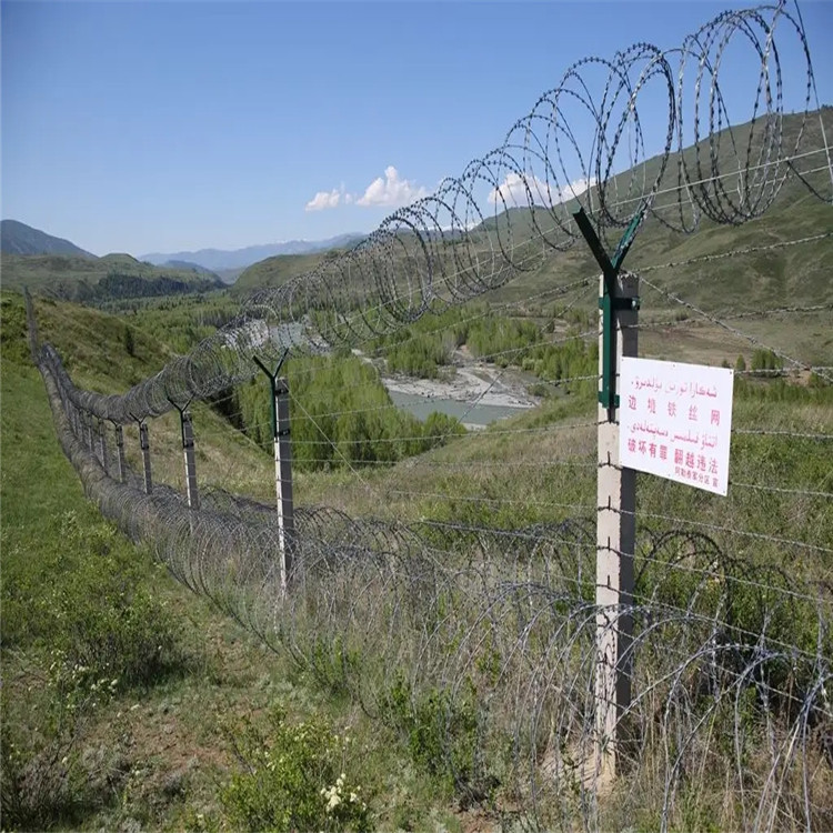 工程案例邊防警戒線圍欄網(wǎng),防攀爬隔離網(wǎng),監(jiān)獄刀片刺網(wǎng)隔離網(wǎng),梅花刺隔離網(wǎng)主要用于監(jiān)獄、看守所、戒毒所、哨所、邊防等的圈禁防護。梅花刺隔離網(wǎng)由美格網(wǎng)和梅花刺片(因其外形類似梅花得名)組合而成的阻絕器材。由于梅花刺隔離網(wǎng)造形獨特不易觸摸,因而能達到很好的防護隔離效果。既美觀又讓人不寒而粟。起到了很好的阻嚇作用。