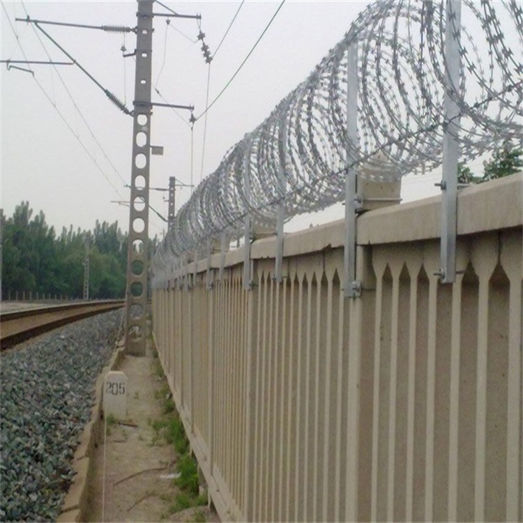 新聞動態(tài)鐵路防護柵欄是為了保障鐵路安全而設置的一種防護設施。它的主要作用是防止人員和動物誤入鐵路,避免發(fā)生意外事故。鐵路兩側上安裝刺絲滾籠不僅能保護列車行車安全,而且還起到保護沿線群眾人身安全的作用。鐵路防護柵欄如何配合刺絲滾籠使用?鐵路刺絲滾籠主要包括刀片剌網(wǎng),刺繩,和支架及卡扣等。配合立柱支架、加密支架、臺階支架安裝在水泥立柱上起到固定的作用,立柱一般間隔3米安裝一個,中間加裝一個加密支架。