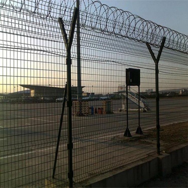 機(jī)場是一個(gè)對安全性要求高的場所,所以防護(hù)欄對于機(jī)場而言就是牢固的外墻, 圍界隔離網(wǎng)又稱作“Y型安全防御護(hù)網(wǎng)”,是由折彎網(wǎng)片,V型支架立柱,加強(qiáng)型焊接片網(wǎng),上面有刀片刺繩(又稱刀片網(wǎng),刀片護(hù)欄)安全防盜連接件組成強(qiáng)度和安全防御性級別很高。被廣泛應(yīng)用在機(jī)場,基地等安全場所。