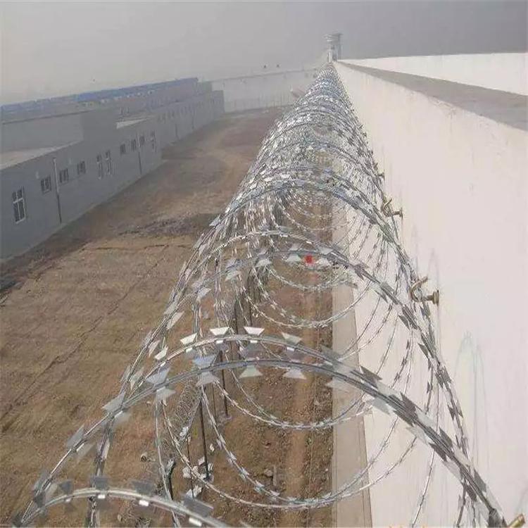 2012年最新《鐵路線路防護柵欄》[通線(2012)8001]通用參考圖出爐! 文獻規(guī)定:鐵路柵欄一改往日焊接鋼絲網柵欄、刺絲網柵欄等產品,改為防御性更強、壽命更長久的:鋼筋混凝土柵欄+0.5米高刺絲滾籠的防護柵欄。詳細內容如下: 鋼筋混凝土柵欄:詳見圖紙 0.5米高刺絲滾籠組成:刺絲刺繩+刀刺滾籠+鋼絲+立柱 圖集中:5、刺絲滾籠:(1)刺絲滾籠采用刀片刺繩繞圈后相鄰兩圈每隔120度用刺絲連接卡固定,張開后形成蛇腹網狀,閉合后刀片刺繩卷徑為50cm,張開后每交叉圈安裝間距20cm,直徑不小于45cm。(2)刀片刺繩由沖切鋼板采用機械軋在鋼絲上成型,刀刺寬度22mm,刀刃垂直間距15mm,刀刺縱向間距34mm,芯絲直徑為2.5mm。刀片厚度0.5mm的Q195鋼板網沖切制作。芯絲由HPB300 -6.5mm高線鋼絲冷拔加工。(3)刺絲滾籠由刺絲連接卡扣與固定在支架上的縱向拉筋相連接??v向拉筋與支架的連接采用-2.5mm的冷拔鍍鋅鋼絲繞2圈后擰緊固定。