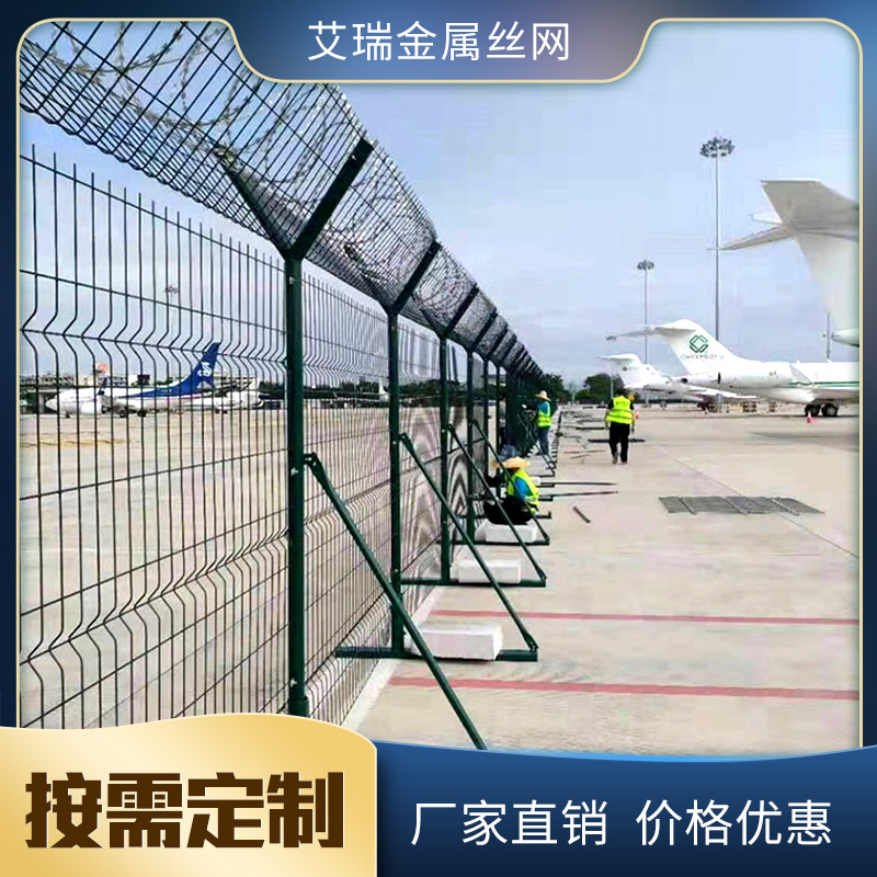 工程案例機(jī)場護(hù)欄網(wǎng)又稱作“Y型安全防御護(hù)網(wǎng)”,是由V型支架立柱,加強(qiáng)型焊接片網(wǎng),安全防盜連接件和熱鍍鋅刀片刺籠組成強(qiáng)度和安全防御性級別很高。近年來,被廣泛應(yīng)用在機(jī)場,軍事基地等高安全場所。注:如果在機(jī)場護(hù)欄網(wǎng)頂部加裝刀片刺絲、刀片刺繩后又很好的增強(qiáng)了安全防護(hù)性能。采用電鍍、熱鍍、噴塑、浸塑等防腐形式,具有很好的抗老化、抗曬、耐候等特點(diǎn)。其產(chǎn)品造型美觀、花色多樣,既起到圍欄作用,又起到美化作用。由于具有安全性高、防攀爬能力好,網(wǎng)片連接方式采用特制SBS緊扣件,有效防止人為的破壞性拆卸,橫向四道折彎加強(qiáng)筋,使網(wǎng)面強(qiáng)度顯著增加。