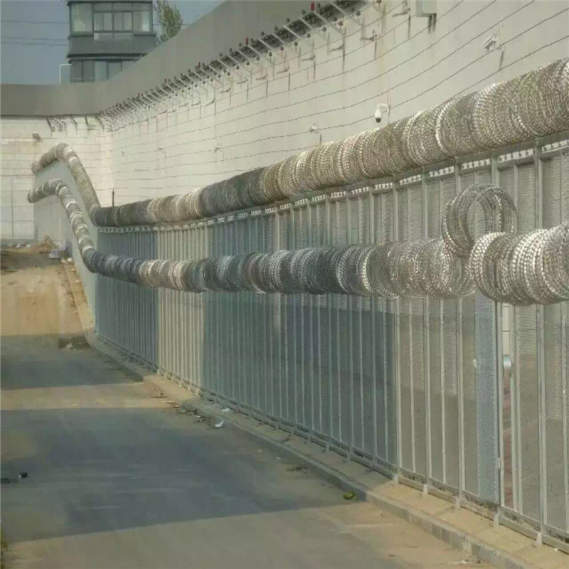 絲)之上,由銳利尖角鍍鋅鋼板或不銹鋼薄板做刀片,高張力鋼絲做芯線組合而成的。鋒利的刀型刺由雙線扣裝后成蛇腹?fàn)?,既美觀又讓人不寒而栗。