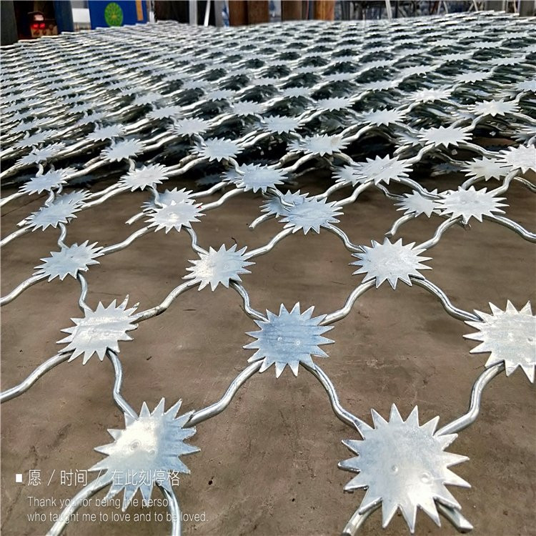 1、監(jiān)獄梅花刺片隔離網(wǎng)為單層梅花刺片網(wǎng),直徑不小于7.5cm,刺片厚1.5mm,采用Q235低碳鋼板沖壓成型。