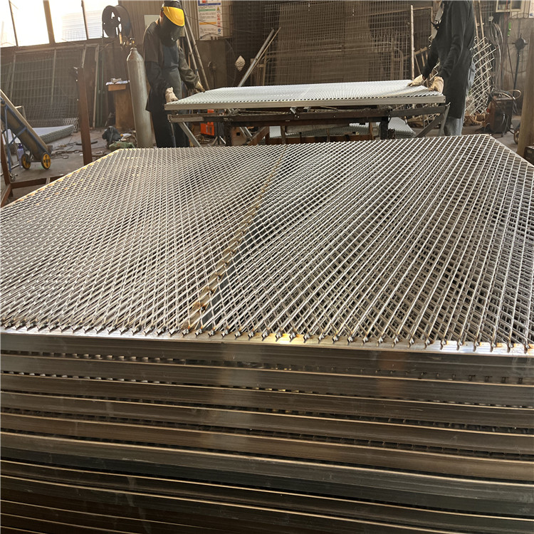 3.鋼板網(wǎng)制作:把成品板經(jīng)過機(jī)器沖剪拉伸成帶有菱形孔狀的鋼板網(wǎng),厚度、孔徑大小按要求,然后焊接在焊接好的邊框上面。