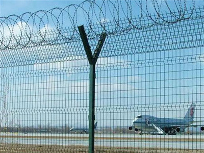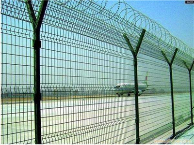 機(jī)場(chǎng)護(hù)欄網(wǎng)又稱作“V型/Y型安全防御護(hù)網(wǎng)”,是由V型/Y型支架立柱加強(qiáng)型焊接片網(wǎng),安全防盜連接件和熱鍍鋅刀片