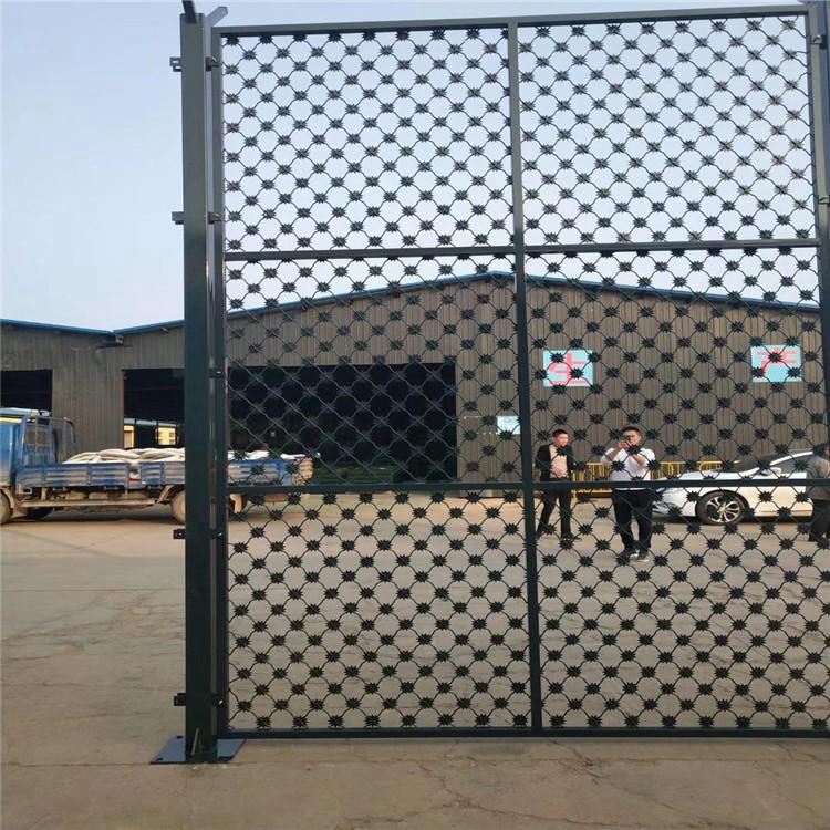 工程案例監(jiān)獄隔離網(wǎng)大門,刀片刺網(wǎng)大門,梅花刺網(wǎng)大門是非常重要的監(jiān)區(qū)安全防護(hù)設(shè)施,是由焊接鋼網(wǎng)加蛇腹形刀刺網(wǎng)組合而成。產(chǎn)品具有結(jié)構(gòu)新穎、堅(jiān)固緊密、網(wǎng)面平整、網(wǎng)孔均勻、刀鋒銳利、防攀爬、耐腐蝕性強(qiáng)等特點(diǎn)。Y型架上邊架蛇腹型刀刺:由熱鍍鋅鋼板或不銹鋼薄板沖壓出尖利的刀片狀,高張力鍍鋅鋼絲或者不銹鋼絲做芯線組合而成的阻盡器材。刀刺直徑采取50或60厘米,刀型整潔、刀片鋒利排列均勻致密、連接堅(jiān)固、防腐才能強(qiáng),可能達(dá)到防擎越、防拆卸更高保險(xiǎn)等級(jí)。