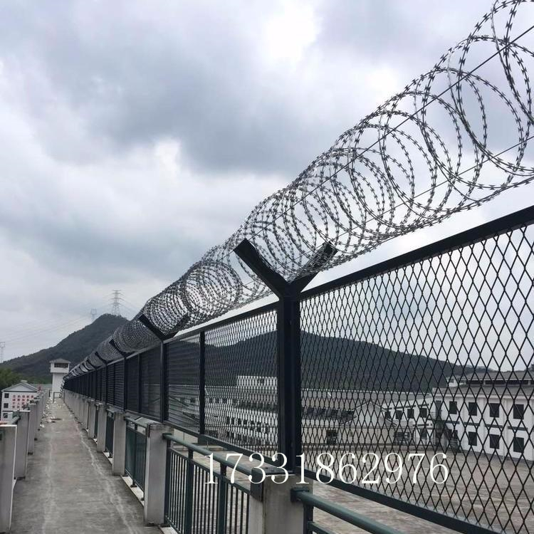 看守所隔離網(wǎng)又稱監(jiān)獄護(hù)欄網(wǎng)或監(jiān)獄隔離柵,主要是采用高強(qiáng)度的刀片刺網(wǎng)與普通防護(hù)網(wǎng)的結(jié)合,由v型支架立拄,加強(qiáng)型焊接片網(wǎng),安全防盜連接件和刀片刺網(wǎng)組成.刀片刺網(wǎng)是一種新型防護(hù)網(wǎng),由銳利尖角鍍鋅鋼板或不銹鋼薄板做刀片,鋼絲做芯線組合而成的防護(hù)器材.