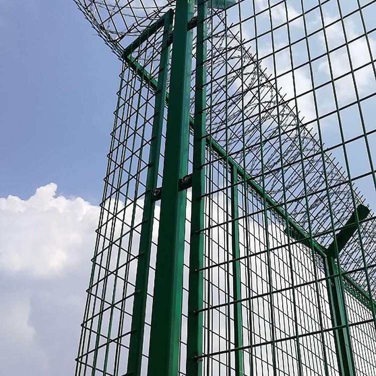 特點(diǎn):如果在機(jī)場(chǎng)護(hù)欄網(wǎng)頂部加裝刀片刺絲、刀片刺繩后又很好的增強(qiáng)了安全防護(hù)性能。采用電鍍、熱鍍、噴塑、浸塑等防腐形式,具有很好的抗老化、抗曬、耐候等特點(diǎn)。其產(chǎn)品造型美觀、花色多樣,既起到圍欄作用,又起到美化作用。由于具有安全性高、防攀爬能力好,網(wǎng)片連接方式采用特制SBS緊扣件,有效防止人為的破壞性拆卸,橫向四道折彎加強(qiáng)筋,使網(wǎng)面強(qiáng)度顯著增加。