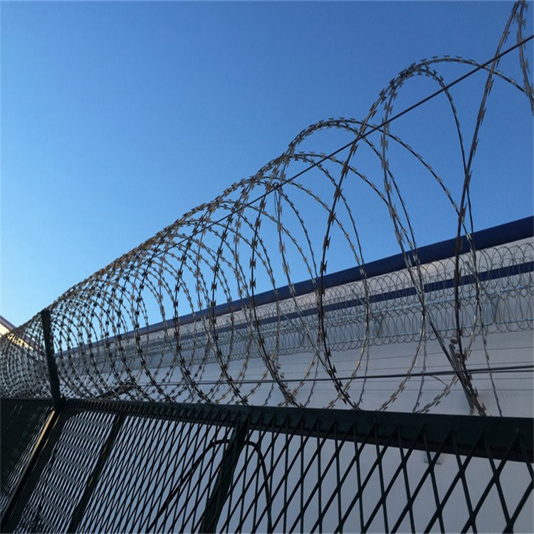 工程案例我們平時見到的隔離網(wǎng)頂部都會加裝蛇腹形刀刺網(wǎng),這個設計主要是在隔離網(wǎng)一層防攀爬效果的基礎上面,再多一道‘安全墻’,這種刀刺網(wǎng)都是利用鋼板沖出刀片來,用專制卡扣固定在一起。兩個圈用卡扣固定,這樣拉伸開才是連貫一圈一圈固定在一起。也可以拉直焊接成網(wǎng)片使用,尺寸:長度和寬度可以根據(jù)客戶需求進行制作,一般常見的長度為2-3米,寬度為1.5米-2.5米??梢愿鶕?jù)不同的用途搭配立柱合邊框進行自由組合。網(wǎng)孔可設計菱形或者方形,材質常見的有不銹鋼、熱鍍鋅等,不同的材質可根據(jù)環(huán)境和使用條件選擇。焊接刀片護欄網(wǎng)作為一種高效的防護設施,其產(chǎn)品規(guī)格和結構特點的不同組合可以滿足不同的使用需求,適用于工廠、學校、軍事基地、機場、大型活動場地等各種需要防護的場所,是一種重要的安全配置。
