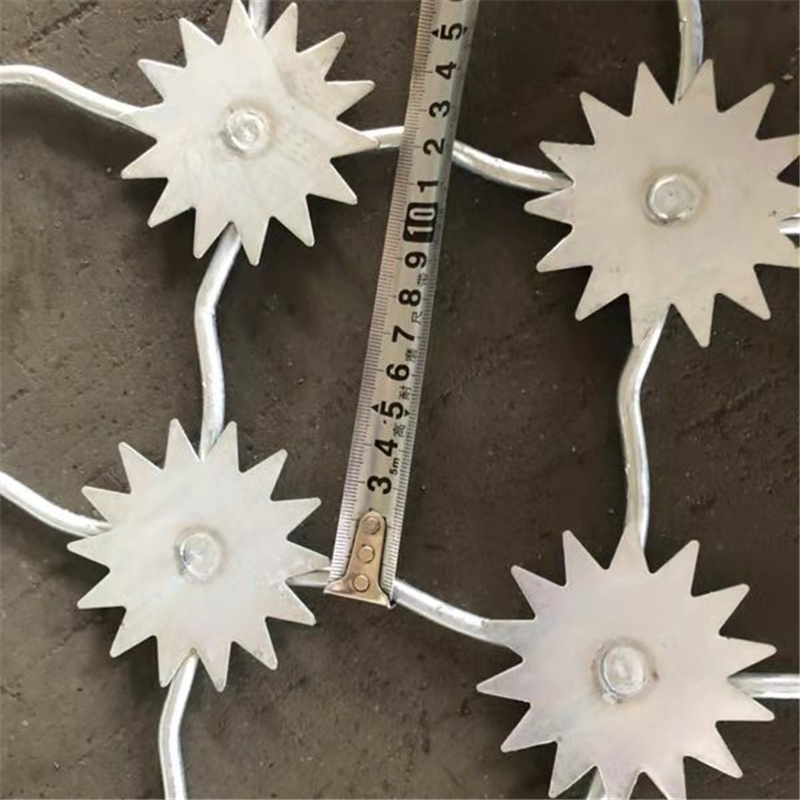 2、網(wǎng)片為菱形網(wǎng)孔,網(wǎng)格尺寸:120mm*110mm(高*寬),網(wǎng)絲直徑8mm,采用S195線材高壓焊接,每一個焊點附焊梅花刺一個。