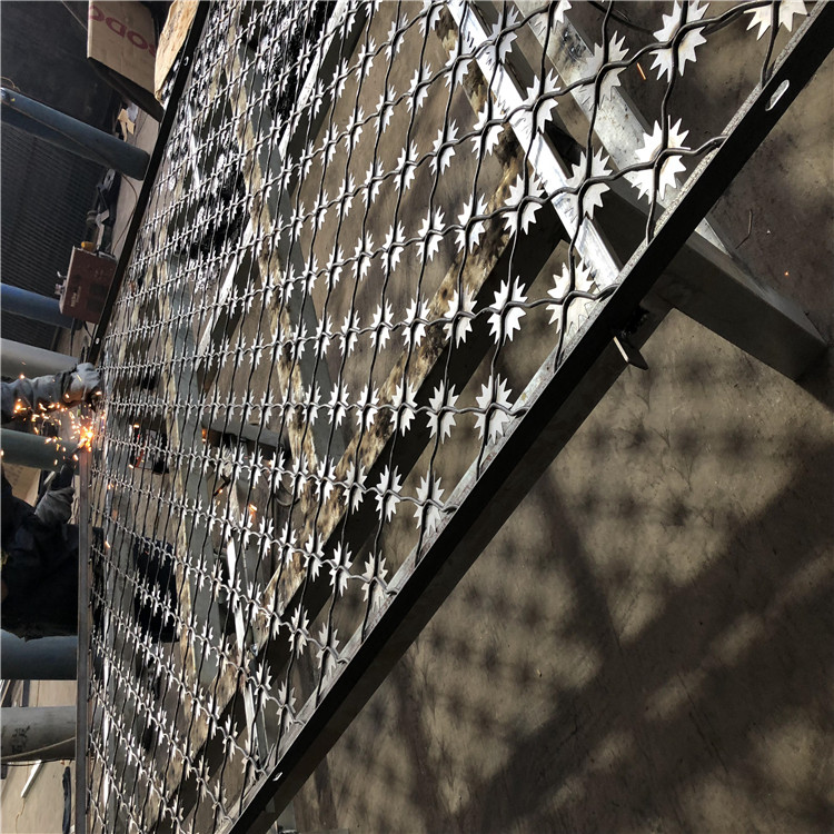 1、監(jiān)獄梅花刺片隔離網(wǎng)為單層梅花刺片網(wǎng),直徑不小于7.5cm,刺片厚1.5mm,采用Q235低碳鋼板沖壓成型。