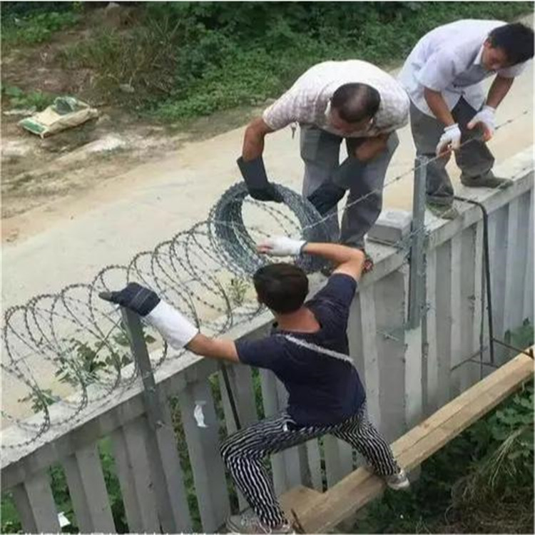 工程案例刀刺網(wǎng)根據(jù)實(shí)際使用場(chǎng)景的不同,采用不同的安裝方式??梢越柚嚓P(guān)支架用以架設(shè)拉線,再用綁絲或者卡扣固定將刺絲滾籠固定與拉線上;也可以用扁鐵壓條直接將刺絲滾籠固定于墻體上;或者直接用綁絲固定在現(xiàn)有圍欄設(shè)施上。