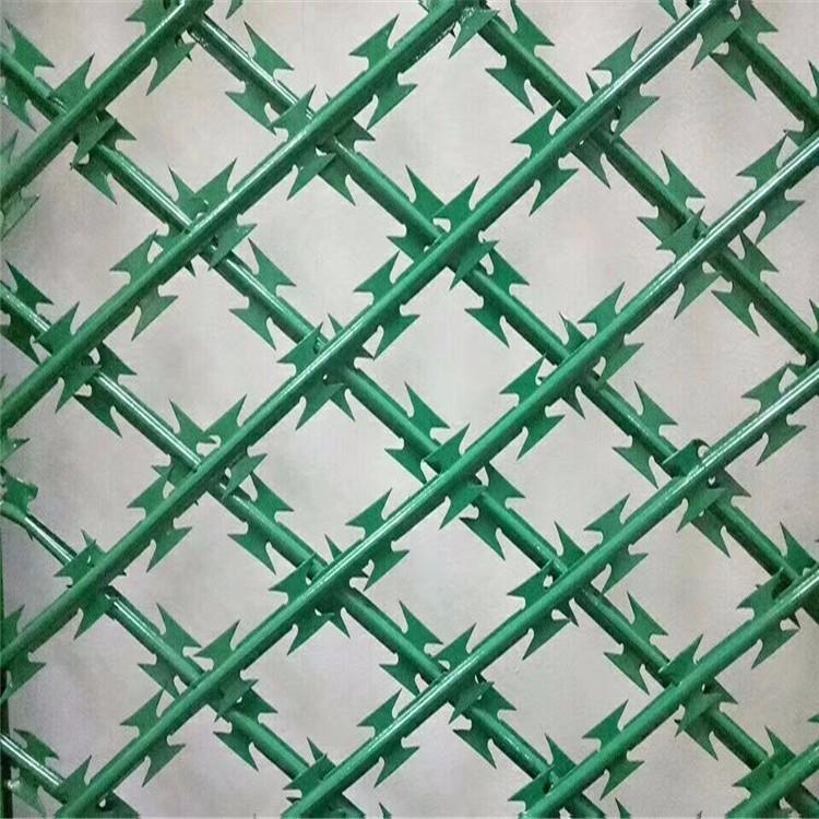 一:焊接的刀片刺網(wǎng)網(wǎng)片菱形狀刺網(wǎng),至于上下螺旋刀片刺網(wǎng)的中間部分,形成的網(wǎng)片是20CM *15CM 孔的刺網(wǎng)片,高度上具有防攀爬,抗沖擊,高安全防護(hù)特性特性,刀片刺網(wǎng)和蛇腹網(wǎng)結(jié)合使用,使人望而卻步,擊破人的僥幸心理。