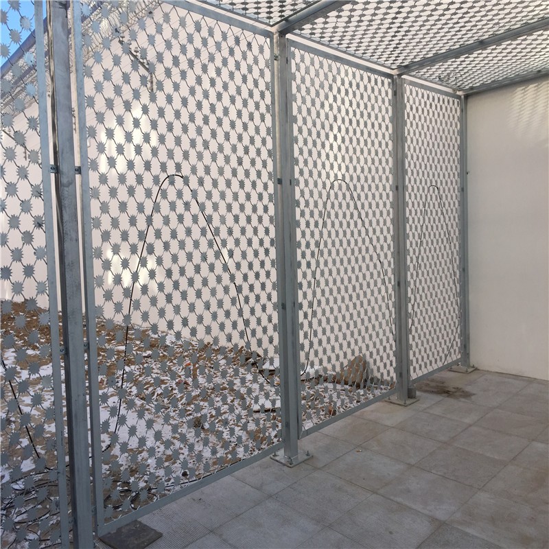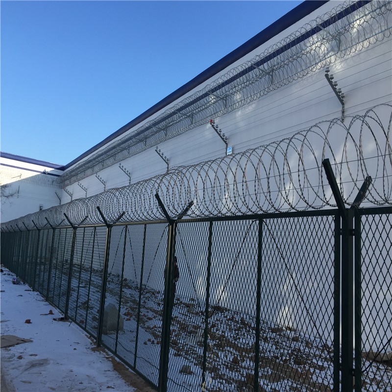 監(jiān)獄刀片刺網(wǎng)主要是由熱鍍鋅鋼板或不銹鋼薄板沖壓而成的,它擁有尖銳的刀片,高張力鍍鋅鋼絲或者不銹鋼絲做芯線組合而成的產(chǎn)品。由于刺網(wǎng)的形狀很特別,而且每個角度都有尖狀刀片,因而能達到極好的防御保護效果。產(chǎn)品具有結(jié)構(gòu)新穎、堅固緊密、網(wǎng)面平整、網(wǎng)孔均勻、刀鋒銳利、防攀爬、抗腐蝕性強等特點。建設于監(jiān)獄的內(nèi)外墻地面及高墻之上,形成一道高不可攀、難以逾越的隔離障礙。具有嚇阻、防翻越等效果,材質(zhì)堅硬,高強度,高張力,造型設計獨特,不宜觸摸,因而能達到極好的防護隔離效果.