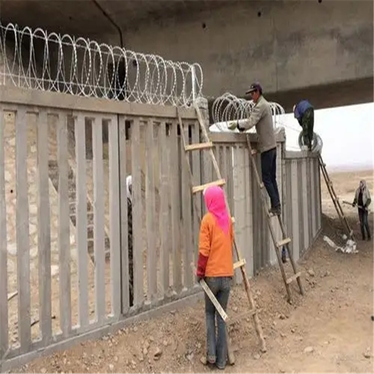 刺絲滾籠安裝工人一定要戴好專用手套,防止被刺絲滾籠扎破。工人不要年齡太大,防止從水泥柵欄上面滑落,造成人員傷亡。安裝刺絲滾籠時一-定要做到“"嚴(yán)直齊美、 間距均勻”美觀和防護的雙結(jié)合。刺絲連接卡的位置,施工中 ,首先要把縱向拉筋拉直,兩道拉筋成平行狀態(tài);均勻的把刺絲滾籠分開,固定加密支架,隨后加固刺絲連接卡。