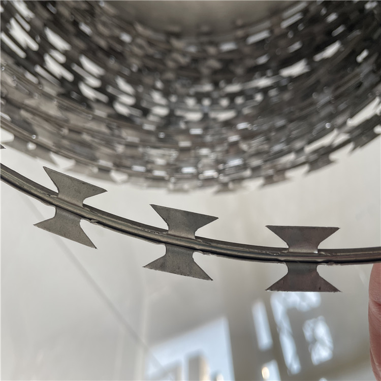 1、制作刀片:選用優(yōu)質(zhì)Q195L熱鍍鋅帶鋼(或者不銹鋼帶鋼),根據(jù)客戶選定的花型,經(jīng)高速沖床,沖軋成鋒利的刀片刺條,把刀片刺條纏成圓餅狀。