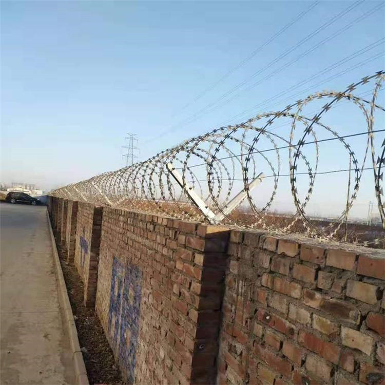 鐵路沿線(xiàn)都比較長(zhǎng)所以都會(huì)用一下比較廉價(jià)的水泥墻來(lái)作為圍墻,但是也因?yàn)樗鄩Φ暮裰兀宰龅亩疾粫?huì)很高還是會(huì)有人或動(dòng)物翻越的危險(xiǎn)。所以在安全防御方面,就應(yīng)生了刀刺網(wǎng)這種產(chǎn)品,南方人喜歡叫刺絲滾籠,北方人喜歡叫刀刺網(wǎng)。刀刺網(wǎng)搭配支架固定在圍墻上也是很不錯(cuò)的防攀爬產(chǎn)品組合,常用于小區(qū),學(xué)校,別墅等。