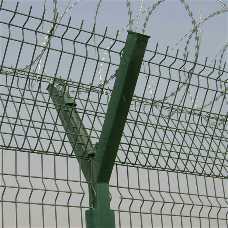 機場護欄 刀片刺絲機場圍界網,是由V型支架立柱加強型焊接片網,安全防盜連接件和熱鍍鋅刀片刺網組成強度和安全防御性級別很高。如果在頂部加裝刀片刺絲、刀片刺網后又很好的增強了安全防護性能。采用電鍍、熱鍍、噴塑、浸塑等防腐形式,具有很好的抗老化、抗曬、耐腐蝕等特點。其產品造型美觀、花色多樣,既起到圍欄作用,又起到美化作用。由于具有安全性高、防攀爬能力好,網片連接方式采用特制SBS緊扣件,有效防止人為的破壞性拆卸,橫向四道折彎加強筋,使網面強度顯著增加。
