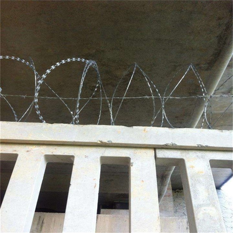 刺絲滾籠主要包括刀片剌網(wǎng),刺繩,和支架等.安裝好后具有很好的阻嚇效果,與能起到相同作用的產(chǎn)品比起來性價比是高很多的.主要制作工藝就是由熱鍍鋅鋼板或者不銹鋼鋼板沖壓出尖銳的刀片,然后由高張力鍍鋅鋼絲或者不銹鋼絲來做芯線組合構(gòu)成的防護(hù)產(chǎn)品。