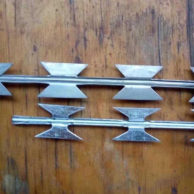 (1)刺絲滾籠采用刀片刺繩繞圈后相鄰兩圈每隔120度用刺絲連接卡固定,張開后形成蛇腹網(wǎng)狀,閉合后刀片刺繩卷徑為50cm,張開后每交叉圈安裝間距20cm,直徑不小于45cm。(2)刀片刺繩由沖切鋼板采用機(jī)械軋?jiān)阡摻z上成型,刀刺寬度22mm,刀刃垂直間距15mm,刀刺縱向間距34mm,芯絲直徑為2.5mm。刀片厚度0.5mm的Q195鋼板網(wǎng)沖切制作。芯絲由HPB300 -6.5mm高線鋼絲冷拔加工。