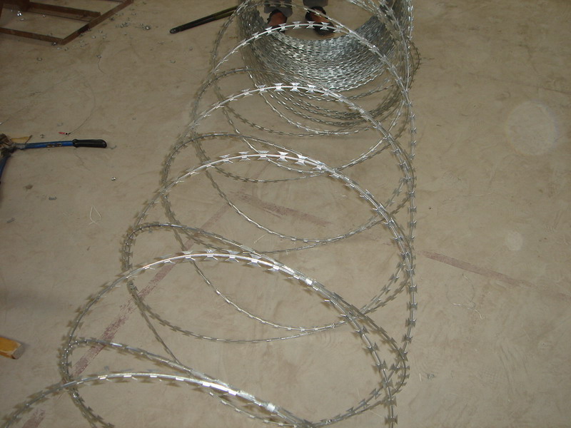刀片刺網(wǎng)阻隔防護(hù)網(wǎng)由銳利尖角鍍鋅鋼板或不銹鋼薄板做刀片,高張力鋼絲做芯線組合而成的阻絕器材。刀刺網(wǎng)焊接網(wǎng)片由刀片型直線刺網(wǎng)交叉焊接成型。刀片刺網(wǎng)的制作工藝并不是非常困難,只要具有特殊的機械和熟練的生產(chǎn)技術(shù)都可以生產(chǎn)出完美的刀片刺網(wǎng)。